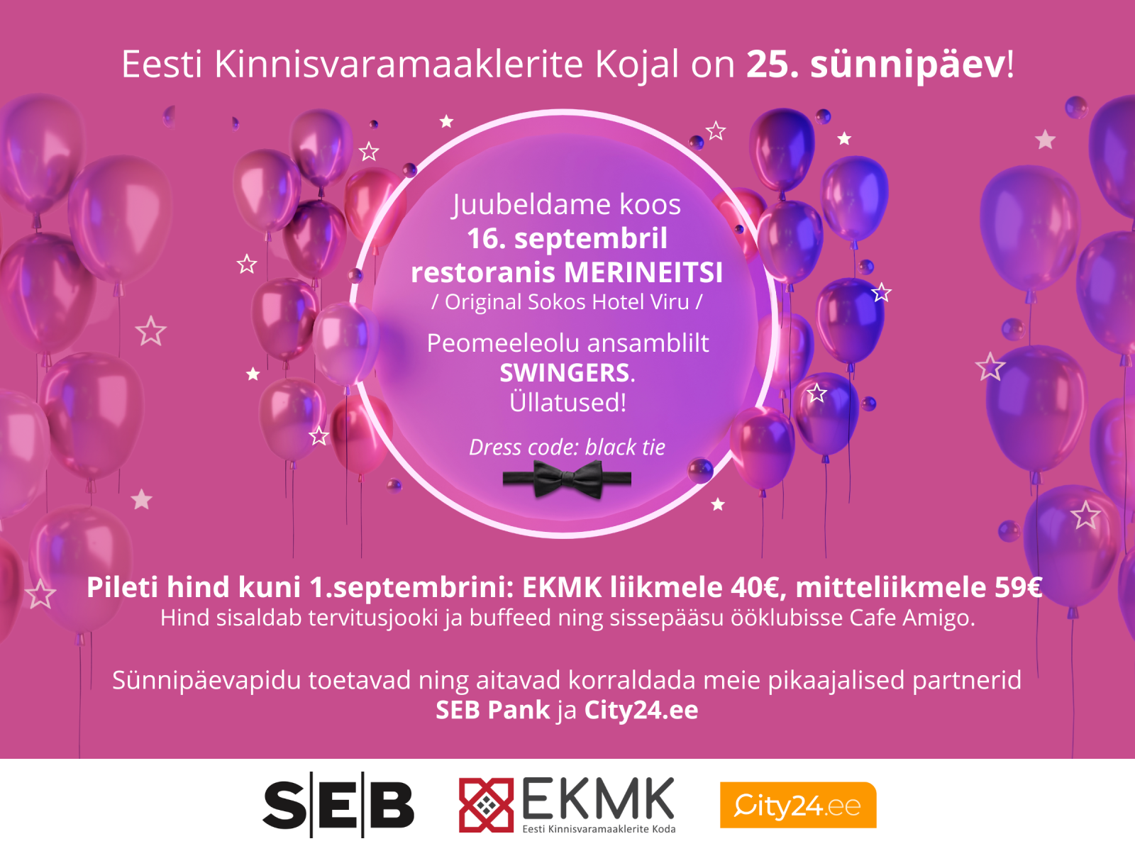 Eesti Kinnisvaramaaklerite Koda kutsub kõiki Koja liikmeid, sõpru ja koostööpartnereid meeleolukale koja 25.sünnipäevapeole.
