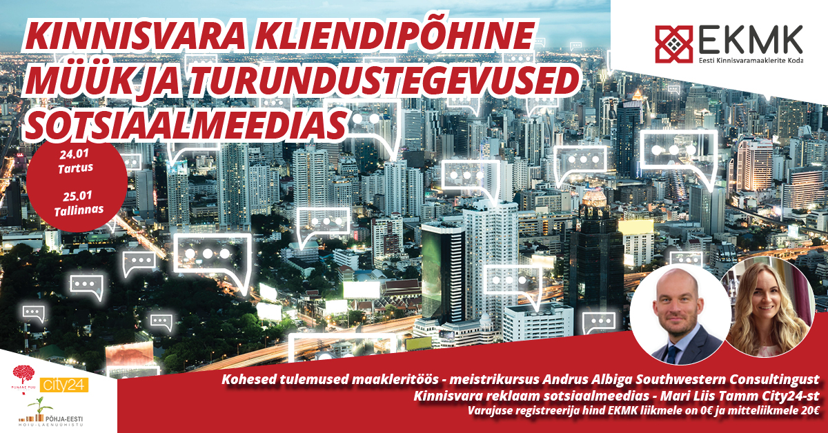 EKMK kutsub osalema jaanuarikuul toimuvale koolitusele Tartus ja Tallinnas. Seekordseks teemaks on kinnisvara kliendipõhine müük ja turundustegevused sotsiaalmeedias. Meile tulevad oma teadmisi jagama Andrus Albi Southwestern Consultingust ja Mari Liis Tamm City24-st.